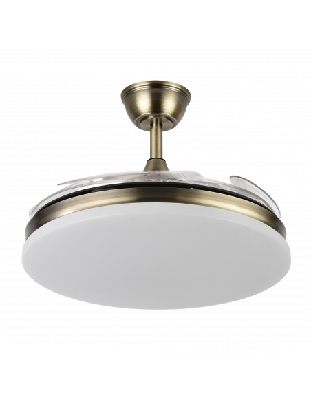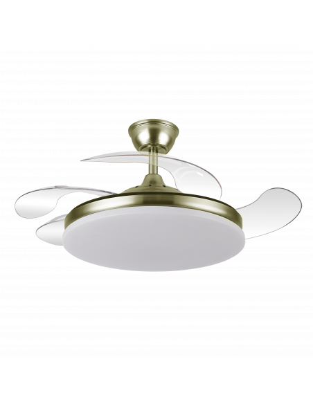 Ventilador DC de la serie TRIDENTE realizado en metal, policarbonato y ABS, en color CUERO con cuatro aspas DESPLEGABLES de ABS transparente muy resistentes. De diseño innovador, ideal para completar tanto en decoraciones modernas como clásicas, realizando tanto la función de lámpara como de ventilador. Motor DC con seis velocidades ajustables. Tecnología LED integrada con una potencia de 59W, 6980 lúmenes y 3 TEMPERATURAS SELECCIONABLES DE LUZ (3000-4000-6000K) luz cálida, natural y blanco frío. Es REGULABLE EN INTENSIDAD, con mando a distancia INCLUIDO con MEMORIA DE COLOR incorporada y TEMPORIZADOR 2/4 H. Control de aire verano o invierno. Su medida es de 34,5/42X50 centímetros con las aspas plegadas y de 34,5/42X107 centímetros con las aspas desplegadas. Incluye dos tijas de 12,5 y 20 centímetros, para colocar a distintas alturas. Encontramos en esta serie dos tamaños de ventiladores y en los colores blanco, negro, níquel y cuero, para elegir el más le guste y el que mejor se adapte a su decoración.