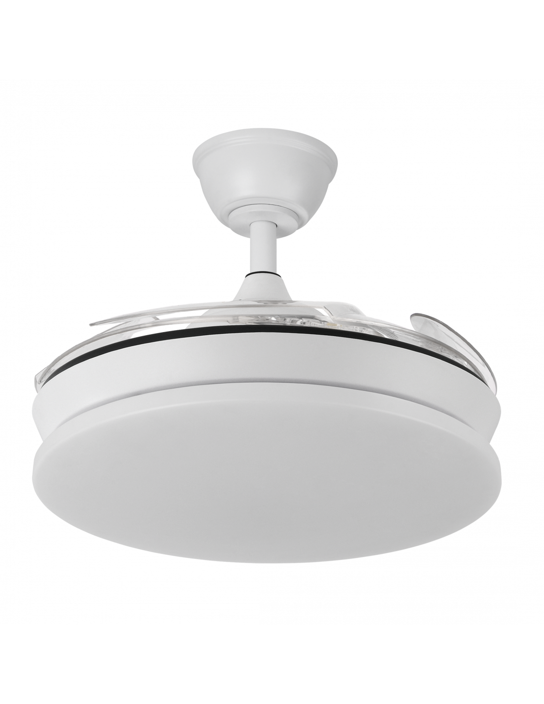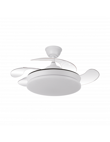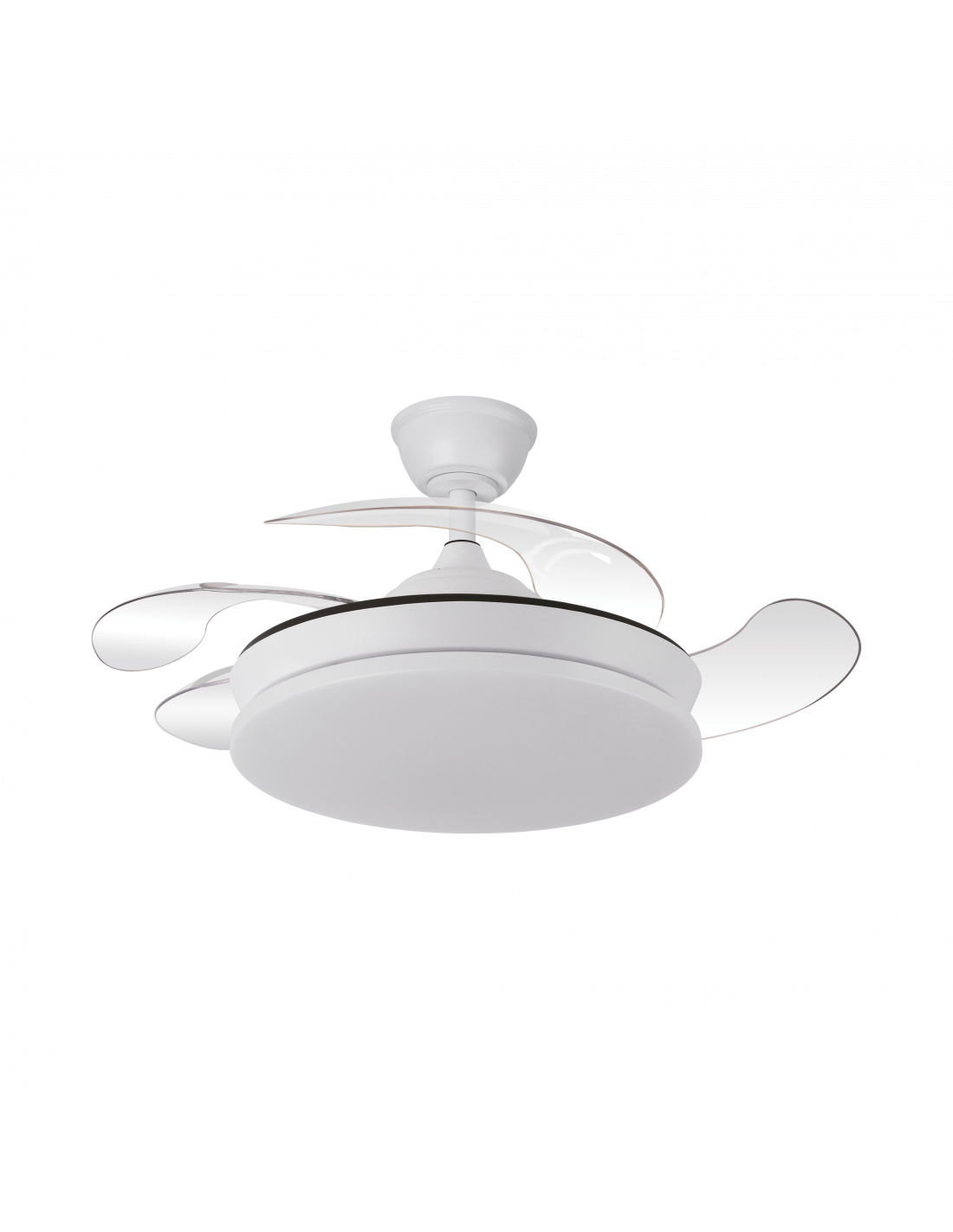 Ventilador DC de la serie TRIDENTE realizado en metal, policarbonato y ABS, en color BLANCO con cuatro aspas DESPLEGABLES de ABS transparente muy resistentes. De diseño innovador, ideal para completar tanto en decoraciones modernas como clásicas, realizando tanto la función de lámpara como de ventilador. Motor DC con seis velocidades ajustables. Tecnología LED integrada con una potencia de 59W, 6980 lúmenes y 3 TEMPERATURAS SELECCIONABLES DE LUZ (3000-4000-6000K) luz cálida, natural y blanco frío. Es REGULABLE EN INTENSIDAD, con mando a distancia INCLUIDO con MEMORIA DE COLOR incorporada y TEMPORIZADOR 2/4 H. Control de aire verano o invierno. Su medida es de 34,5/42X50 centímetros con las aspas plegadas y de 34,5/42X107 centímetros con las aspas desplegadas. Incluye dos tijas de 12,5 y 20 centímetros, para colocar a distintas alturas. Encontramos en esta serie dos tamaños de ventiladores y en los colores blanco, negro, níquel y cuero, para elegir el más le guste y el que mejor se adapte a su decoración.
