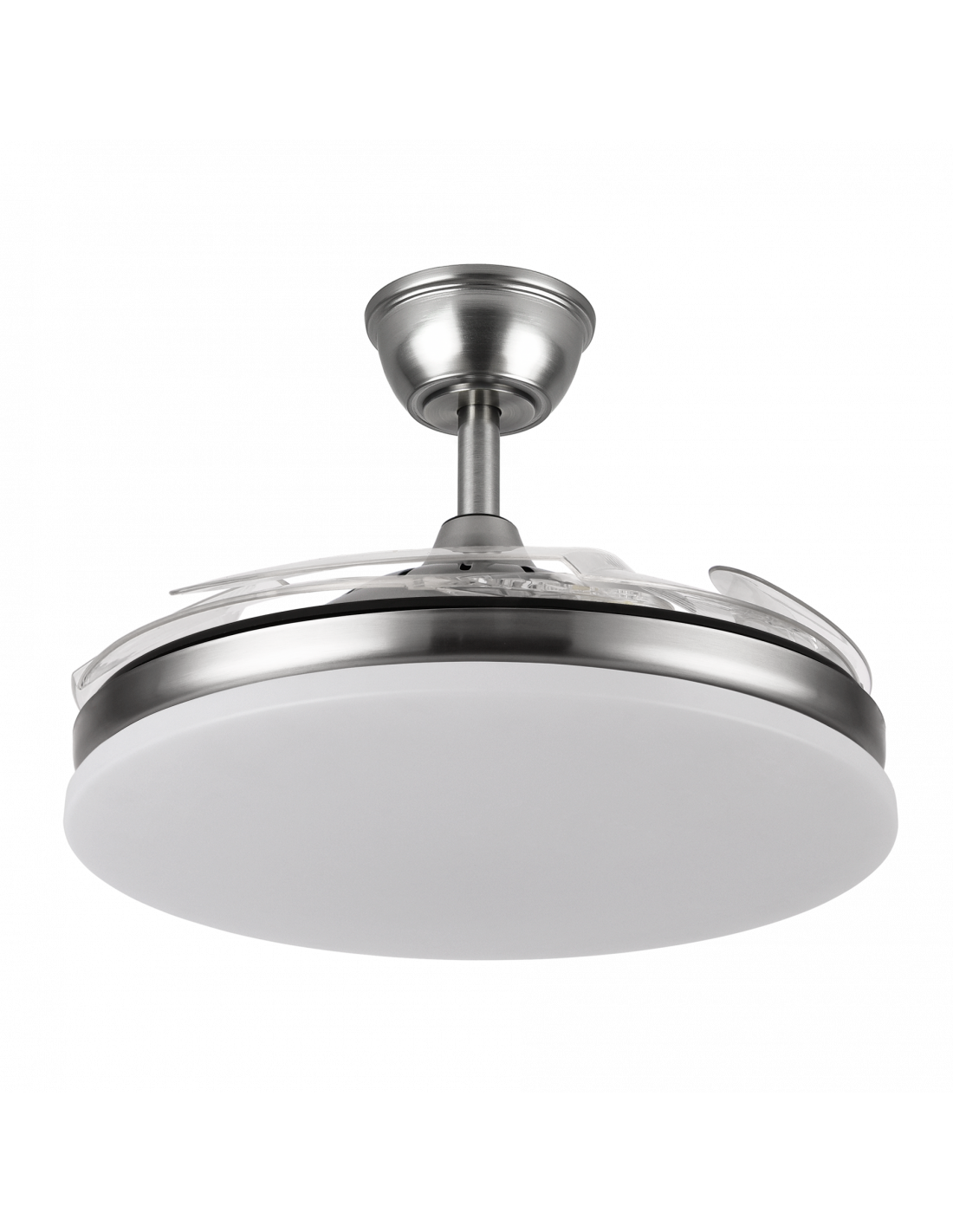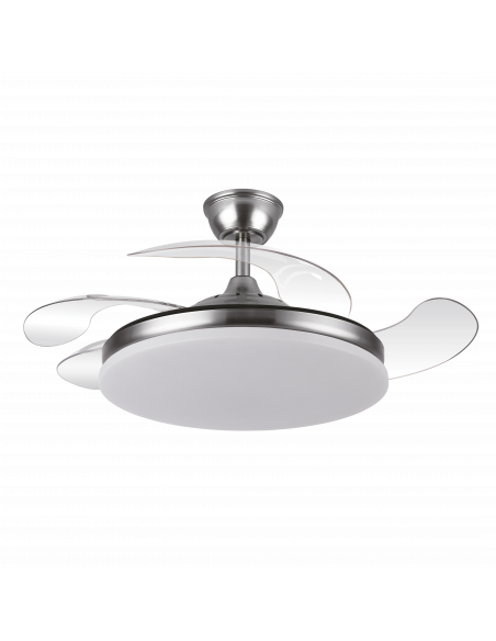 Ventilador DC de la serie TRIDENTE realizado en metal, policarbonato y ABS, en color NIQUEL con cuatro aspas DESPLEGABLES de ABS transparente muy resistentes. De diseño innovador, ideal para completar tanto en decoraciones modernas como clásicas, realizando tanto la función de lámpara como de ventilador. Motor DC con seis velocidades ajustables. Tecnología LED integrada con una potencia de 59W, 6980 lúmenes y 3 TEMPERATURAS SELECCIONABLES DE LUZ (3000-4000-6000K) luz cálida, natural y blanco frío. Es REGULABLE EN INTENSIDAD, con mando a distancia INCLUIDO con MEMORIA DE COLOR incorporada y TEMPORIZADOR 2/4 H. Control de aire verano o invierno. Su medida es de 34,5/42X50 centímetros con las aspas plegadas y de 34,5/42X107 centímetros con las aspas desplegadas. Incluye dos tijas de 12,5 y 20 centímetros, para colocar a distintas alturas. Encontramos en esta serie dos tamaños de ventiladores y en los colores blanco, negro, níquel y cuero, para elegir el más le guste y el que mejor se adapte a su decoración.