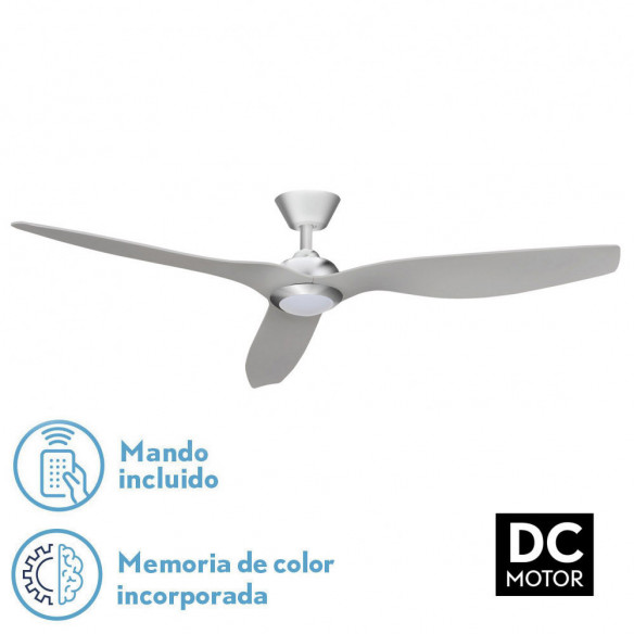 Ventilador DELFOS color NIQUEL/PLATA. Realizado en metal, ABS y policarbonato. Motro DC, con tres palas y seis velocidades. Tiene una potencia de luz de 18 watios, 2350 lúmenes y 3000k, 4000K, 6000k. Su medida es de 32/44,5x132d centímetros, con dos medidas de Tija para diferentes alturas de techo. Control de aire verano-invierno. Mando a distancia incluido, con memoria y temporizador.