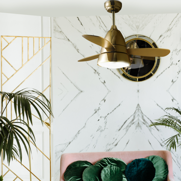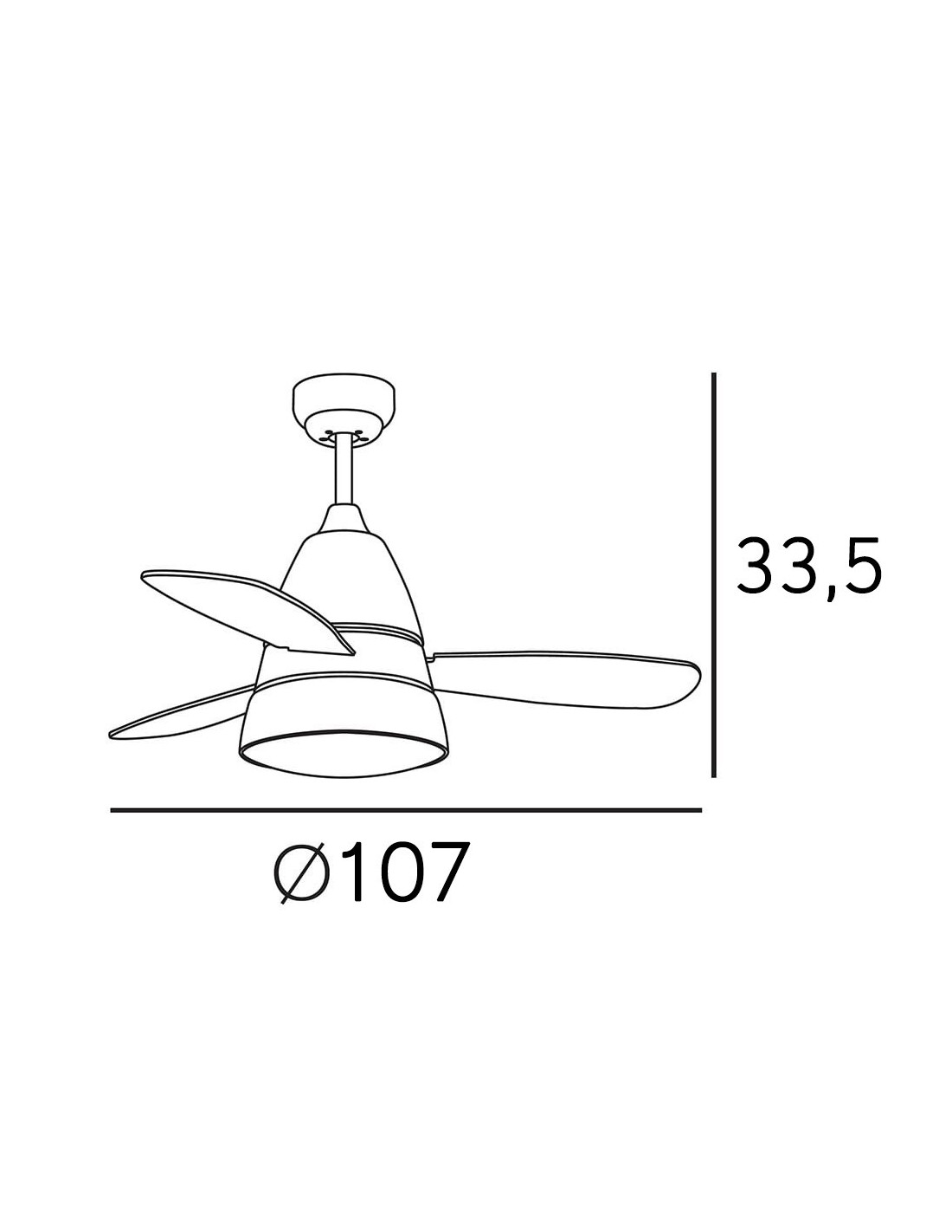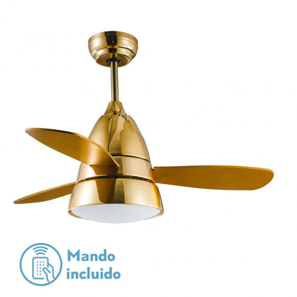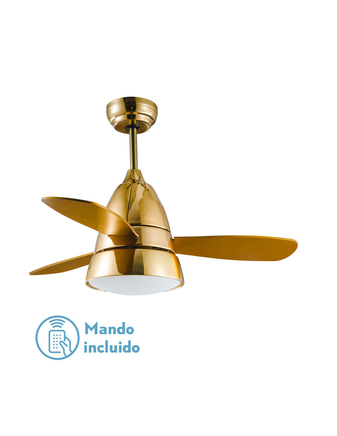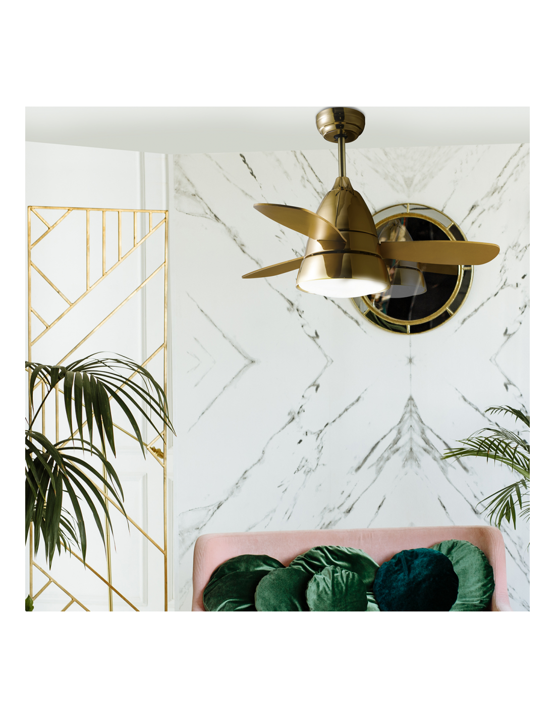 Ventilador ISERAN realizado en metal, madera MDF y cristal ácido. De color ORO FRANCÉS con tres aspas y tres velocidades. Tiene una medida de 33,5X107X107 centímetros. Posee dos portalámparas en E27. Bombillas no incluidas. Mando a distancia INCLUIDO. Modelo también disponible en color Cromo.